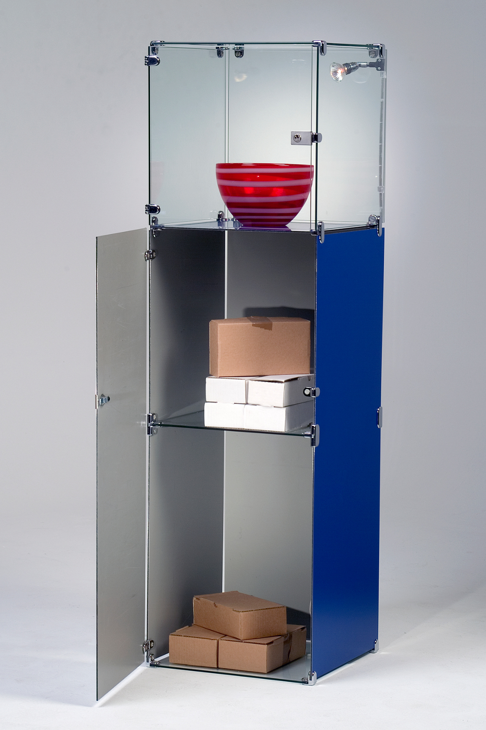 Der Sockel verfügt wie auch der Glaskubus über eine abschließbare Dreh-/Schwenktüre. Außerdem ist in dem Sockel nochmals ein zusätzlicher Zwischenboden enthalten. Dieser wird mit unseren Einlageplattenverbindern befestigt und ist nicht höhenverstellbar.