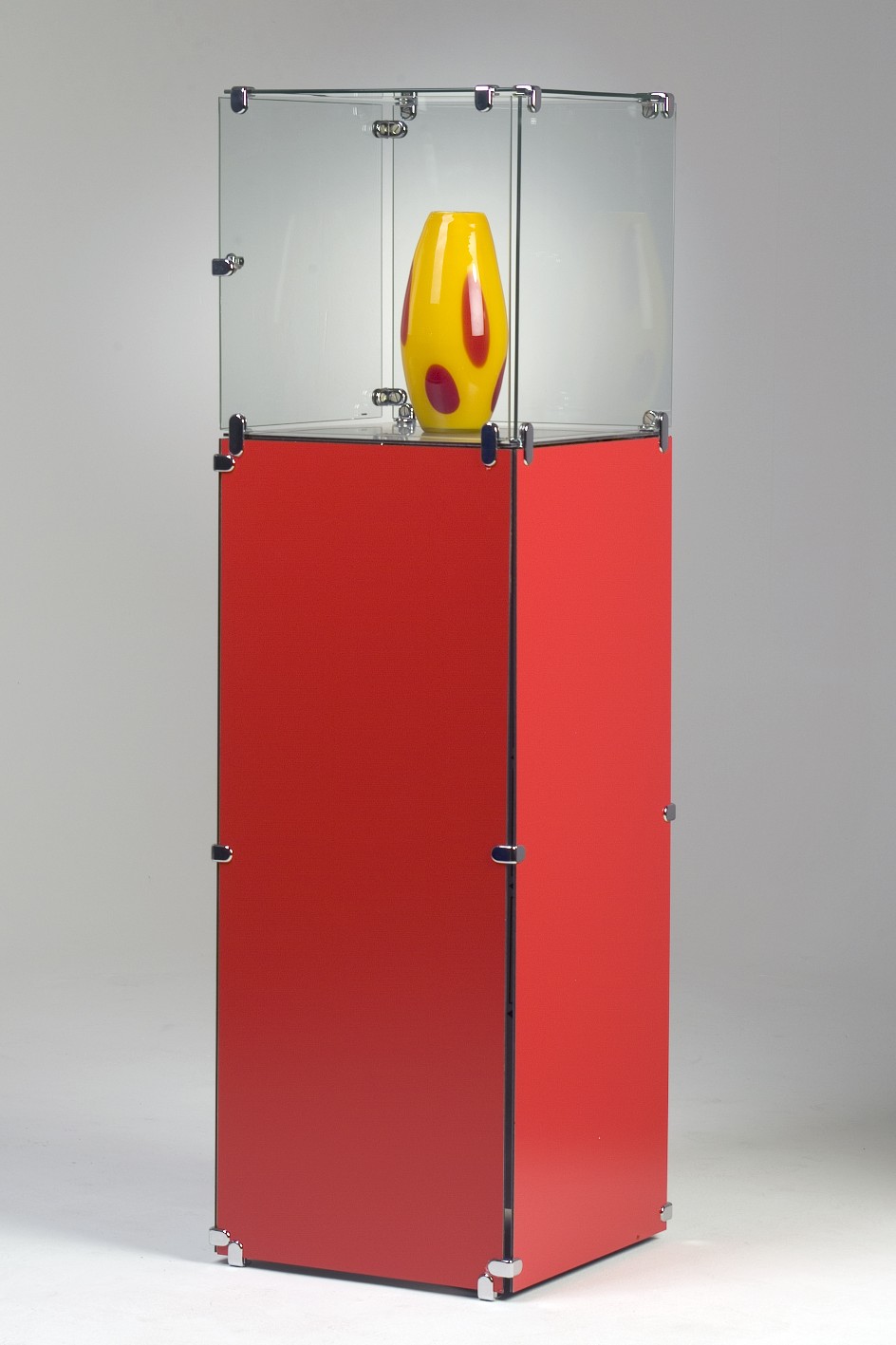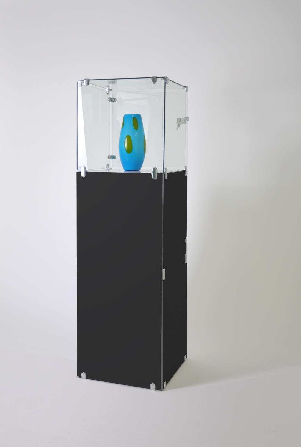 Der Sockel ist eine Kombination aus unseren Alu-Kunststoff-Verbundplatten und unseren bewährten Metallverbindern mit Klemmschraube. Der Glaswürfel besteht aus 4 ESG Sicherheitsglasplatten und 1 abschließbaren Dreh-/Schwenktüre; der Glasaufsatz wird ebenfalls mit unseren Metallverbindern befestigt. Der Sockel verfügt über einen Zwischenboden. Um das Spaltmaß zwischen den senkrechten Platten des Sockels zu reduzieren werden diese vorgestanzt, sodass die Verbinder etwas vertieft an der Platte befestigt werden können und somit die Platten nahezu aneinanderstoßen.