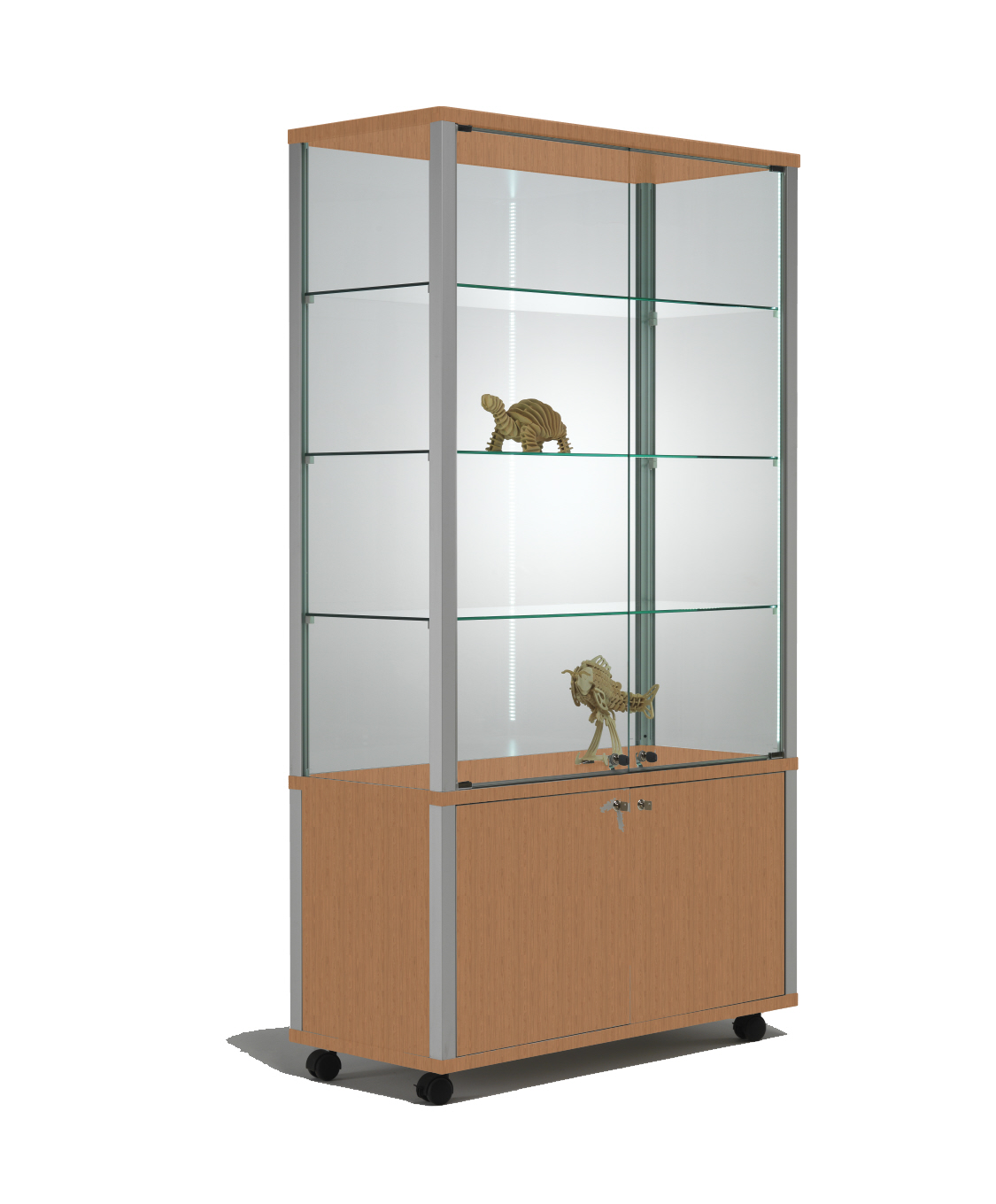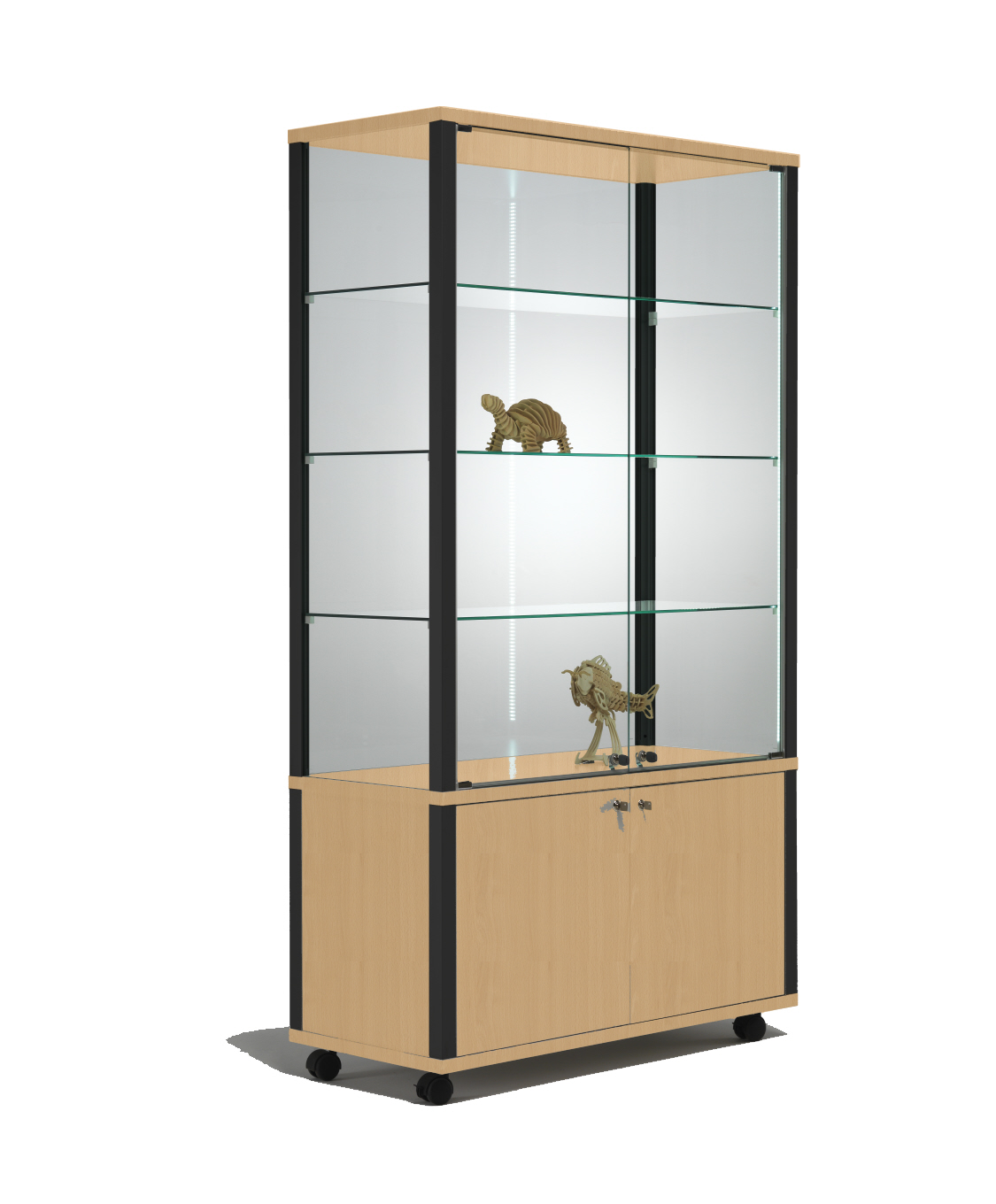 Unsere Serie QuadraM verfügt über 4 senkrechte, verstärkte quadratische Profile. Der Boden und Deckel ist eine 25 mm beschichtete Holzplatte. Die Vitrine verfügt über 4-seitige Verglasung aus ESG Sicherheitsglas. Alle Gläser sind mit unseren MHN-Dichtungsleisten in das Profilsystem eingefasst. Auch die Türen verfügen über umlaufende Dichtungslippen an den Rahmenteilen, sodass Ihre Objekte und Ausstellungsstücke optimal vor Staub geschützt sind.Der Unterschrank hat eine Höhe von 52,5 cm (+ Rollen bzw. Standfüße). Die Füllelemente sind beschichtete Holzplatten. Der Unterschrank verfügt wie auch die Vitrine über abschließbare Türen. Die Glas-Fachböden der Vitrine sind aus ESG Sicherheitsglas und stufenlos höhenverstellbar. Die Traglast je Fachböden beträgt bei verteilter Last ca. 15-20 kg. Die Vitrine wird bereits vormontiert geliefert - nur die Fachböden sind nach dem Auspacken noch einzulegen. Die Fachbodenträger sind bereits in gleichmäßigen Abständen an den Profilen montiert.